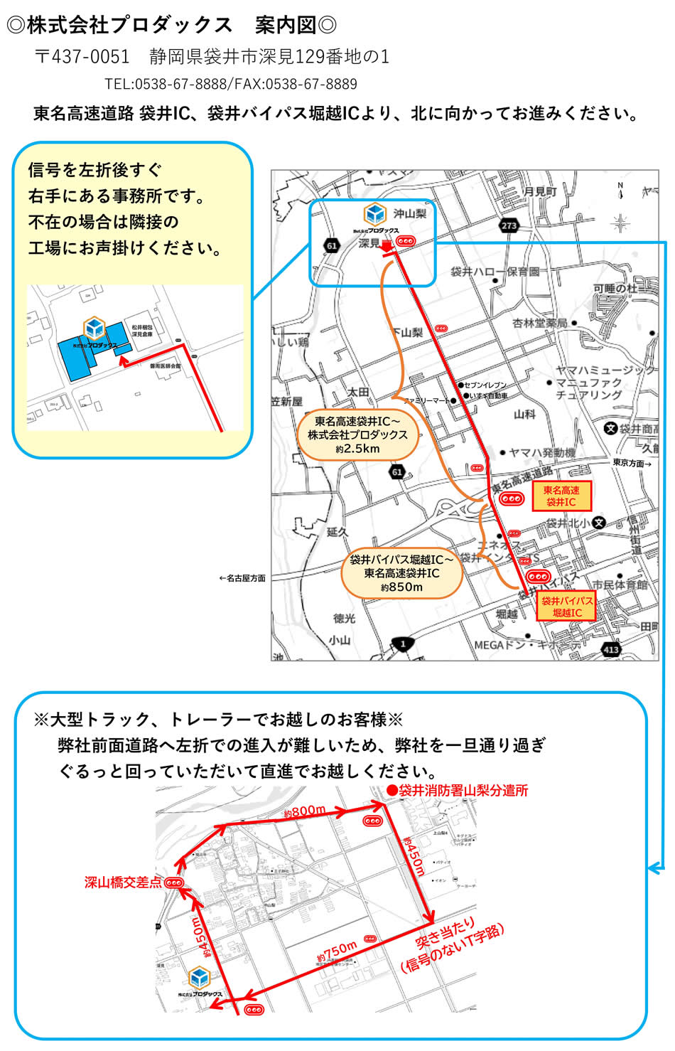東名高速道路「袋井インター」より北へ約 2 km 【本社・工場】〒437-0051 静岡県袋井市深見129-1 tel 0538-67-8888 fax 0538-67-8889