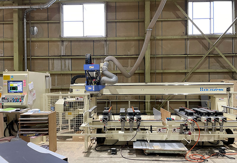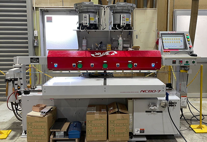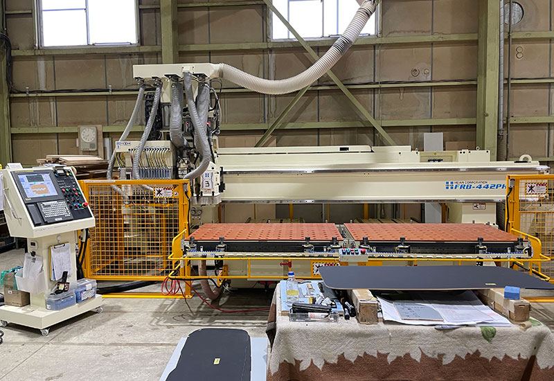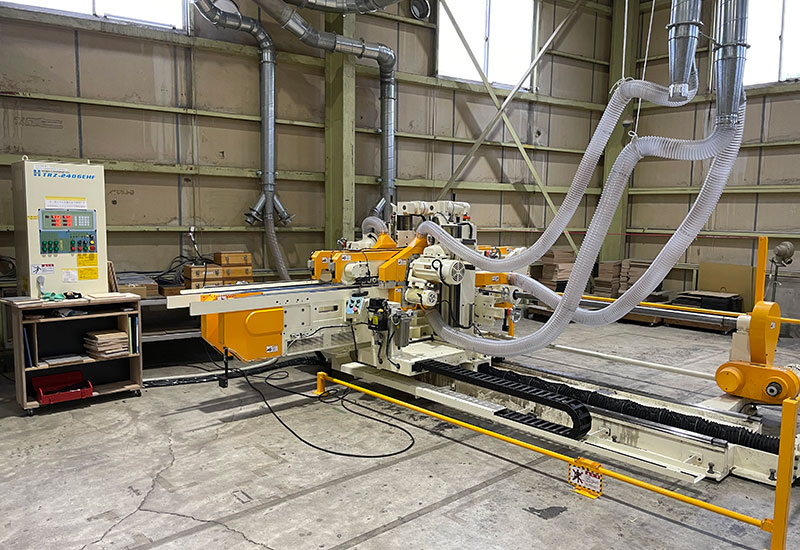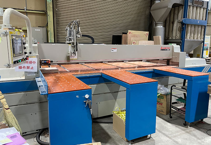 | 【設備一覧】 NC(最大4×10尺)・・・2台 ダボ打ち機・・・1台 テノーナー(最大開口8尺)・・・1台 ランニングソー(最大10×8尺)・・・1台 パネルソー(最大高8尺)・・・1台 軸傾斜横切盤・・・1台 軸傾斜盤・・・1台 縁貼り機・・・1台 曲面貼り機・・・1台 高速面取り盤・・・2台 マルチボーリングマシン・・・1台 ボール盤・・・2台 角ノミ盤・・・1台 手押し鉋盤・・・1台 自動鉋盤・・・1台 ワイドサンダー・・・1台 エコノミーサンダー・・・1台 フラッシュプレス機(最大4×10尺)・・・3台 縦型プレス機(最大8尺)・・・1台 組立機・・・1台 両面糊付け機(最大4尺)・・・1台 工業用ミシン・・・1台 その他小型工具 4tウイングトラック・・・1台 1tバン・・・1台 フォークリフト(1.5~2.5t)・・・3台 |